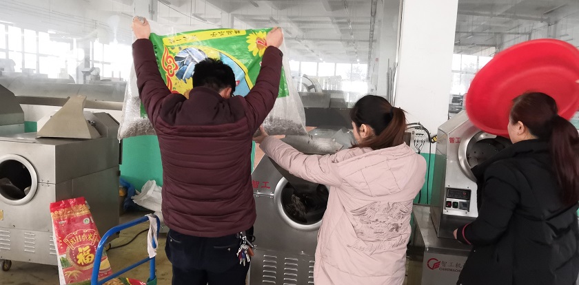今日(2018-12-29),湖北随州客户来厂试机dccz5-10花生炒货机,分别使用该机炒制一锅原味瓜子和小日本花生果,对于炒制效果非常满意!