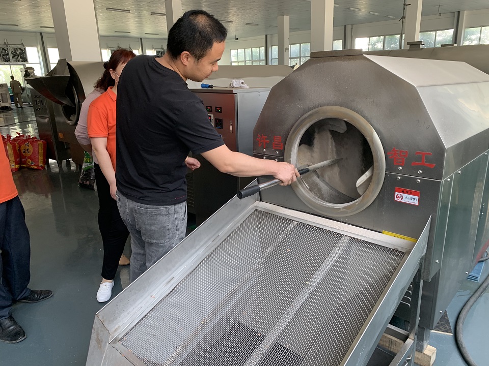 2020年5月3日,安徽亳州客户亲临许昌智工试机DCCZ7-10电磁炒货机炒制大豆,经现场炒制,出锅大豆饱满圆润色泽金黄,客户表示出锅的大豆完全符合生产需求,表达对许昌智工机械制造有限公司机器的肯定。