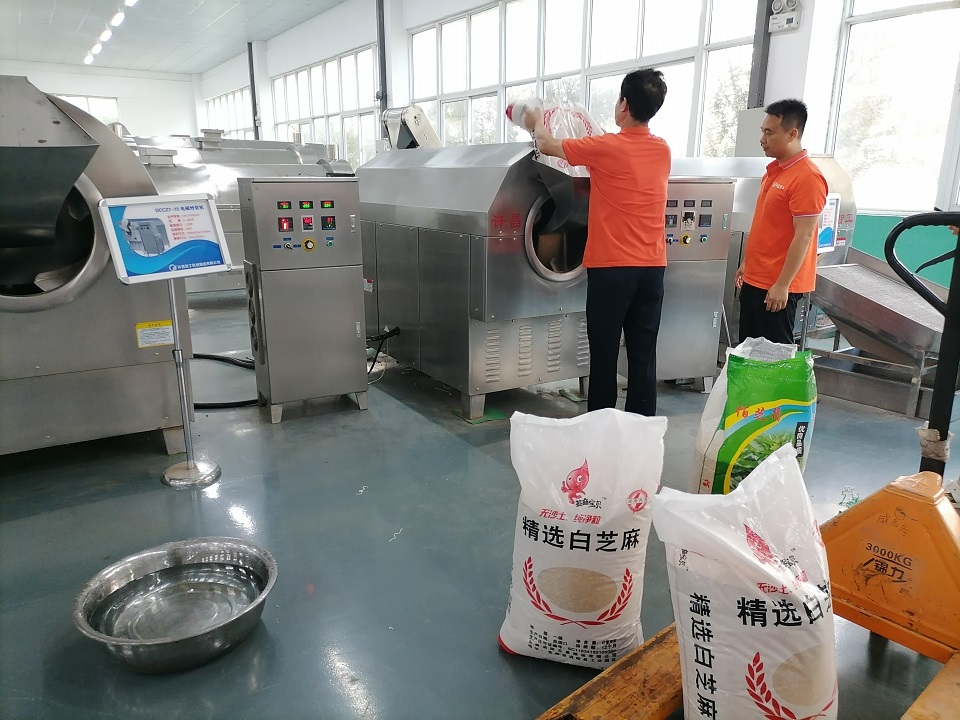 2020年09月11日,客户来到许昌智工试机DCCZ7-15炒制磨酱芝麻。许昌智工电磁炒货机炒制五谷杂粮、干果、坚果、膨化食品和休闲食品的,自动化程度非常高,利用电磁感应锅体直接加热,升温快,温度高,食用盐等介质可不出锅循环翻炒,避免了热量流失,节能环保;强大的智能控温系统,控温精确,炒制过程中锅内温度始终保持一致,省时省力省人工,内置变频调节器,温度,转速,火力大小,均可随意调节,操作简单上手快,适合各种物料的炒制。