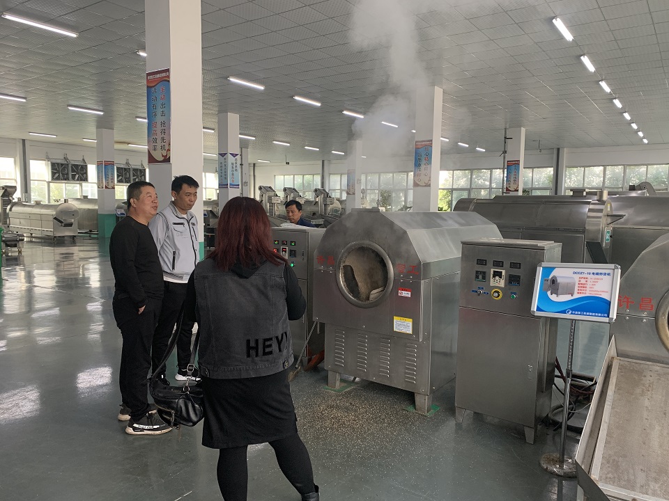 客户考察许昌智工4米流水线电磁炒货机炒瓜子